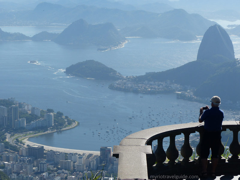 Visitor on Corcovado Mountain taking photos of Rio de Janeiro with Sugar Loaf in the background